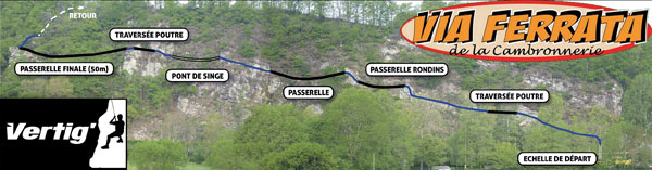 Ceux parcours avec 2 niveaux: AD et Difficile. Avec une tyrolienne de 35 m et une deuxième dans l'extension qui ne figure pas sur le topo ci-dessus. Cette deuxième tyrolienne n'est pas très rapide.